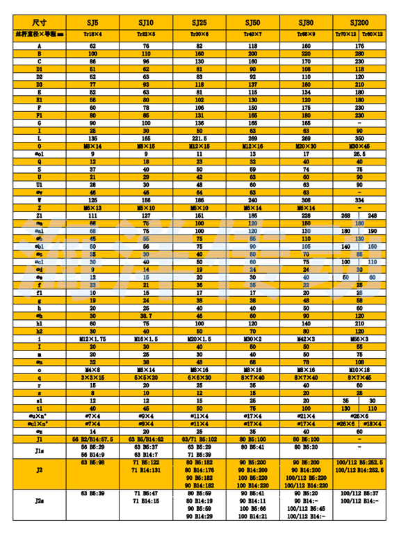 SJ螺旋升降機的設計,緊湊的鋁齒輪箱體,與 MA系列有更低的價格額定負載: 0.5噸 - 20噸 推桿升降速度可至30mm/s 高輸入轉速:1500rpm 工作制:20%(10分鐘運行2分鐘)可選擇雙頭,三頭絲杠配套,參數咨詢我公司附件:齒隙抵消裝置,防轉轉置,安全螺母,防塵罩,磁感應限位開關 MA系列普通齒螺旋升降機