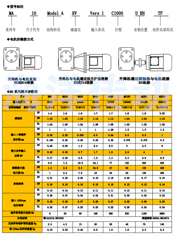 MA系列普通齒螺旋升降機 更適合重載應用:重負荷,高頻繁工作制 額定負載: 0.5噸 -35噸 推桿升降速度可至75mm/s 高輸入轉速: 3000rpm 工作制:30%(10分鐘運行3分鐘) 可選擇雙頭,三頭絲杠配套,參數咨詢我公司 附件:齒隙抵消裝置,防轉轉置,安全螺母,防塵罩,磁感應限位開關