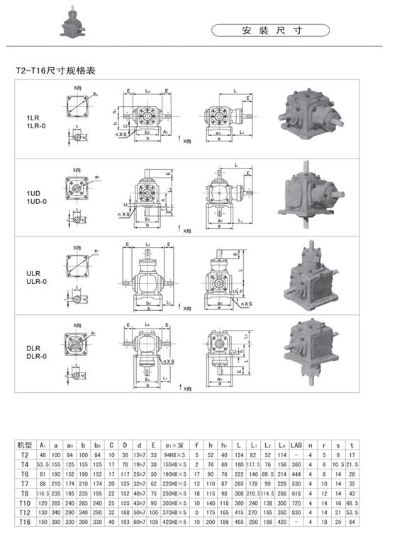 產品型號:T2、 T4 、T6 、T7 、T8、 T10、 T12、 T16 、T20、 T25 詳細說明:t系列螺旋傘齒輪,采用軸輸入,軸輸出結構,可單軸、多軸輸出,可正反方向旋轉,結構緊湊,占用空間小。因本公司專業生產銷售各類減速機及支架,大小品種規格繁多,價格按型號及規格的不同而不等,而在網上不能將同一系列的多個型號、多種規格一一列出