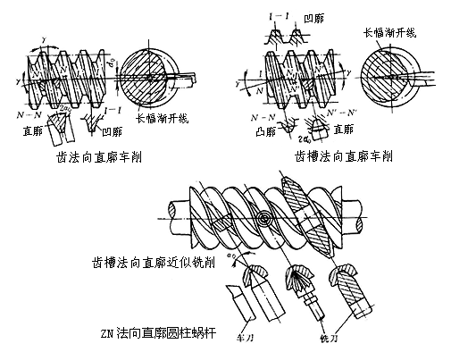 法面直廓圓柱蝸桿蝸桿齒廓在法向截面中為直線,在軸面中微呈凹形曲線,在端截面中齒廓為長幅漸開線。齒形由直線刃成形刀具切削生成,刀具在軸面中與切入方向說成角度等于分度圓柱導(dǎo)程角,成齒線與分度圓柱上蝸桿螺線切線所成角度為齒形角。