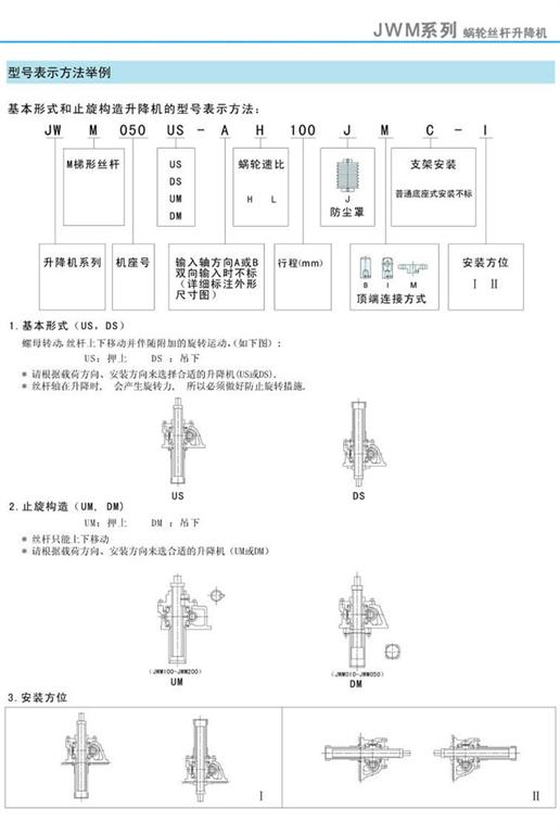 減速機|蝸輪絲桿升降機-JWM絲桿升降機基本形式、止旋構造及型號表示方法-海洋傳動