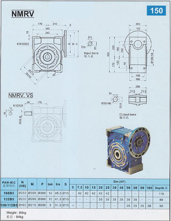 NMRV/RV150型蝸輪蝸桿減速機中心距150mm,同其他RV系列減速機相同,可軸輸入、法蘭輸入、法蘭輸出、軸輸出等多種方式。