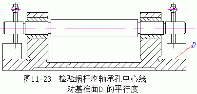 蝸桿座基準面D可用專用研具刮研,研點應為8~10/25×25mm2。檢驗軸承中心線對D面的平行度,如圖11—23所示,符合要求后裝入蝸桿,配磨調整墊片(補償環),以保證蝸桿軸線位于蝸輪的中央截面內。與此同時,徑向調整蝸桿座,達到規定的接觸斑點后,配鉆鉸蝸桿座與底座的定位銷孔,裝上定位銷,擰緊螺釘。側隙大小的檢查,通常將百分表測頭沿蝸輪齒圈切向接觸于蝸輪齒面可工作臺相應的凸面,固定蝸桿(有自鎖能力的蝸桿不需固定),搖擺工作臺(或蝸輪),百分表的讀數差即為側隙的大小。